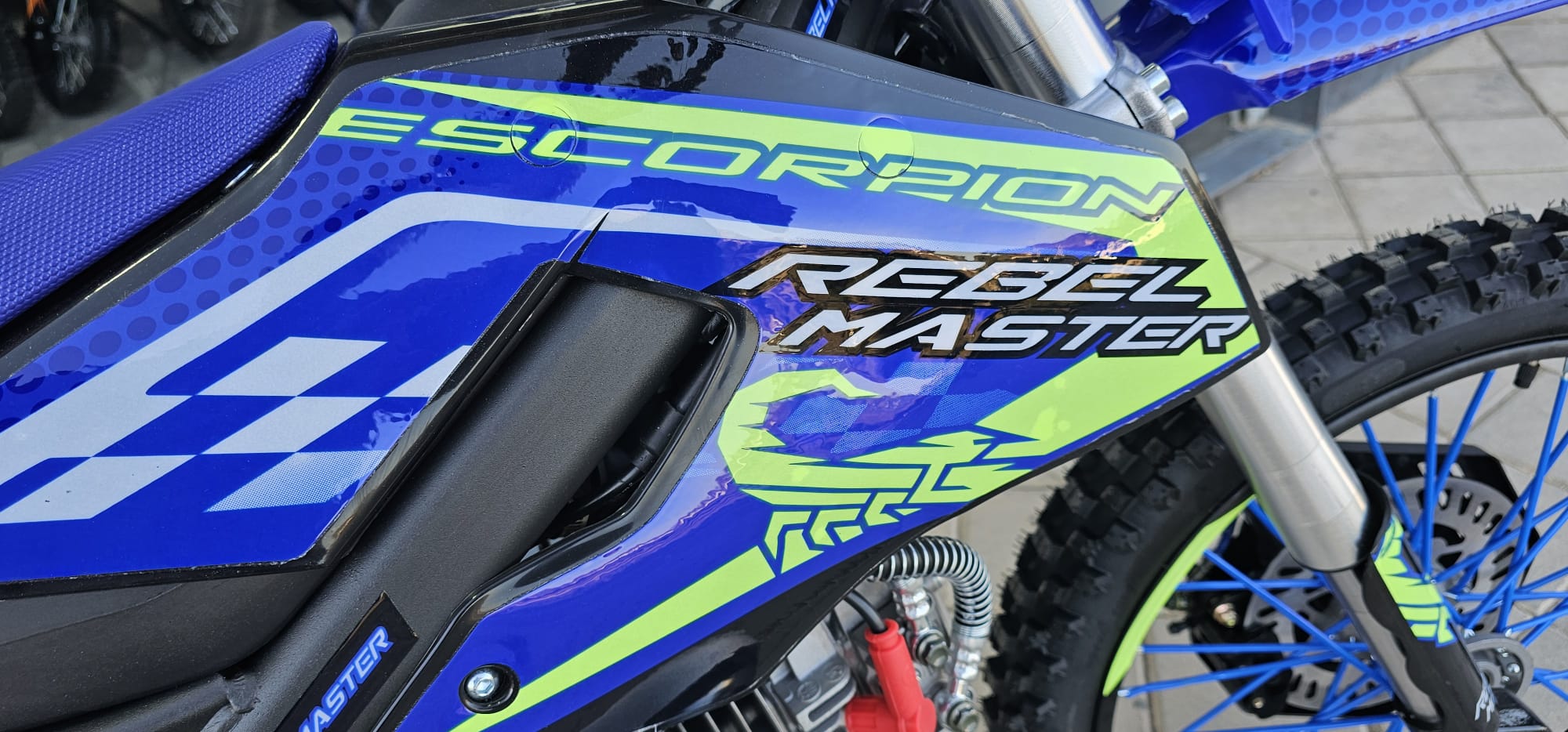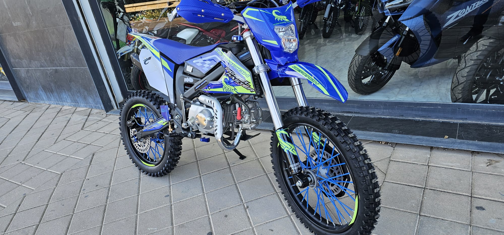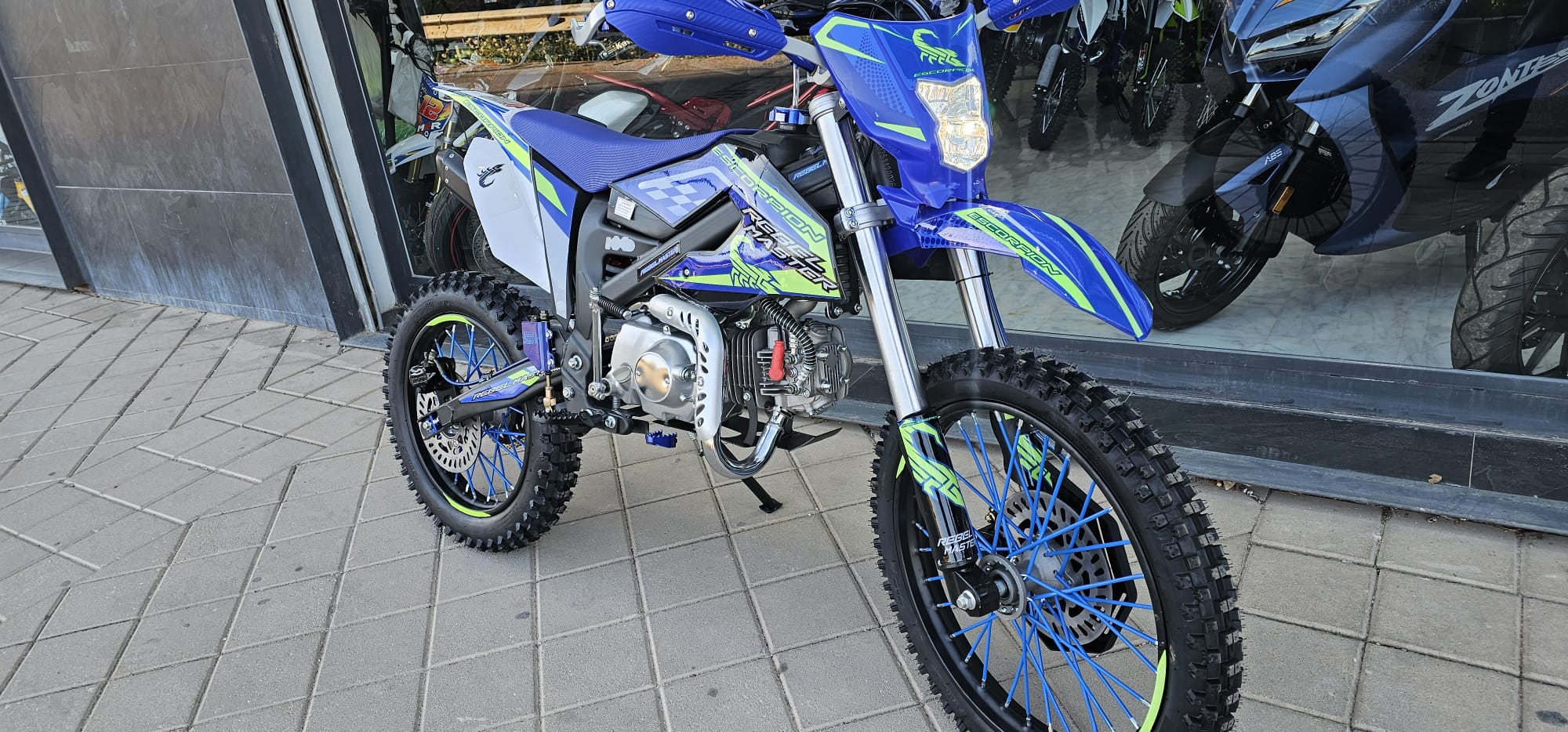 Moto de cross REBEL MASTER 140 SCORPION XXL con detalles en azul y verde.no matriculable