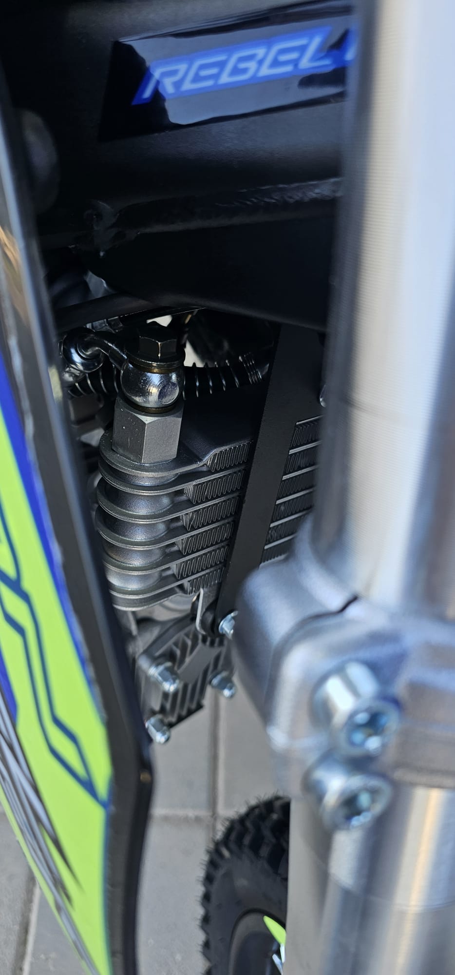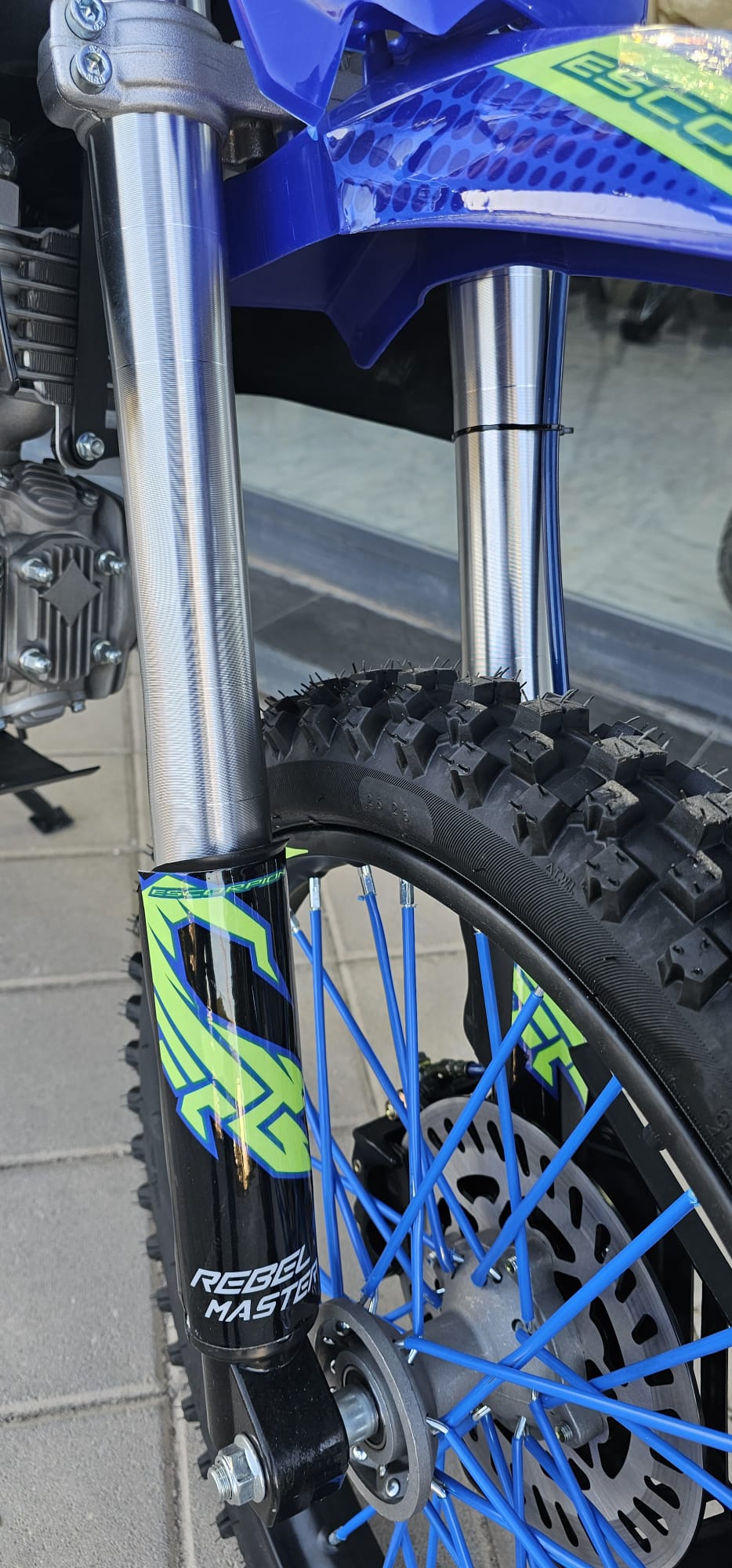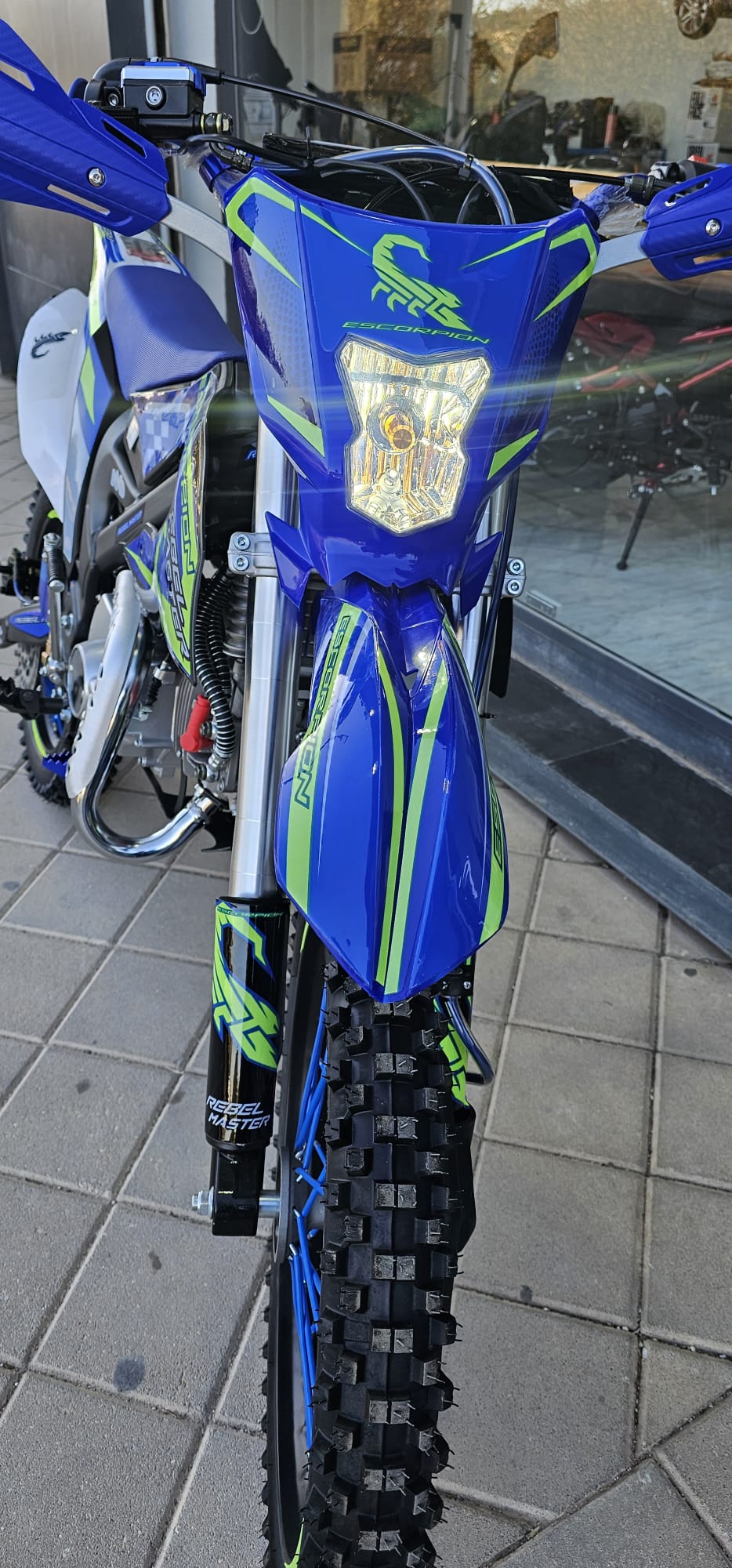 Moto de cross REBEL MASTER 140 SCORPION XXL con detalles en azul y verde.no matriculable